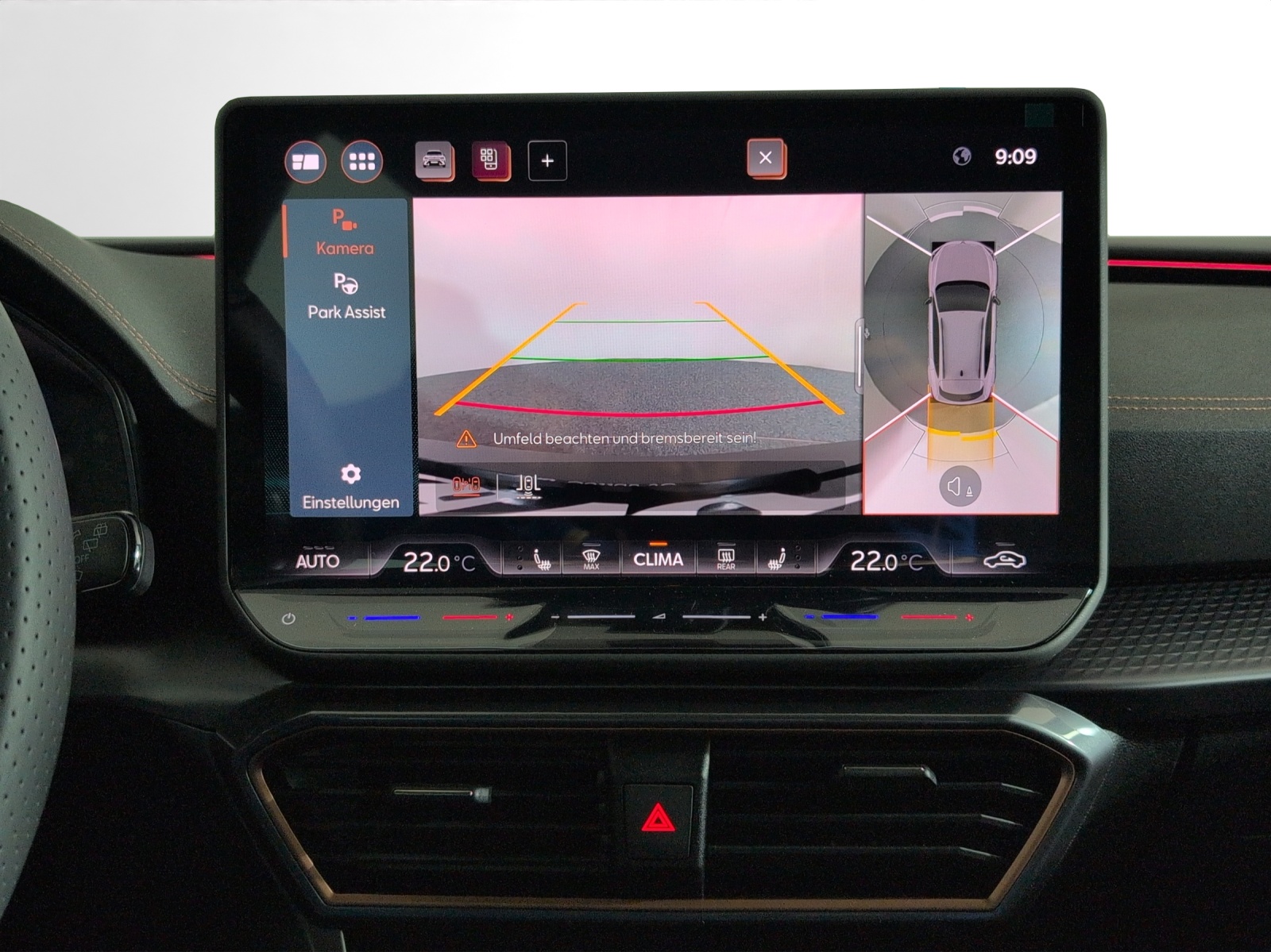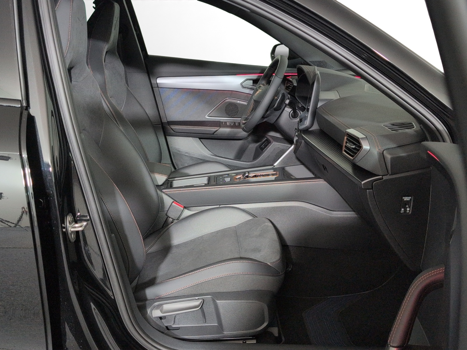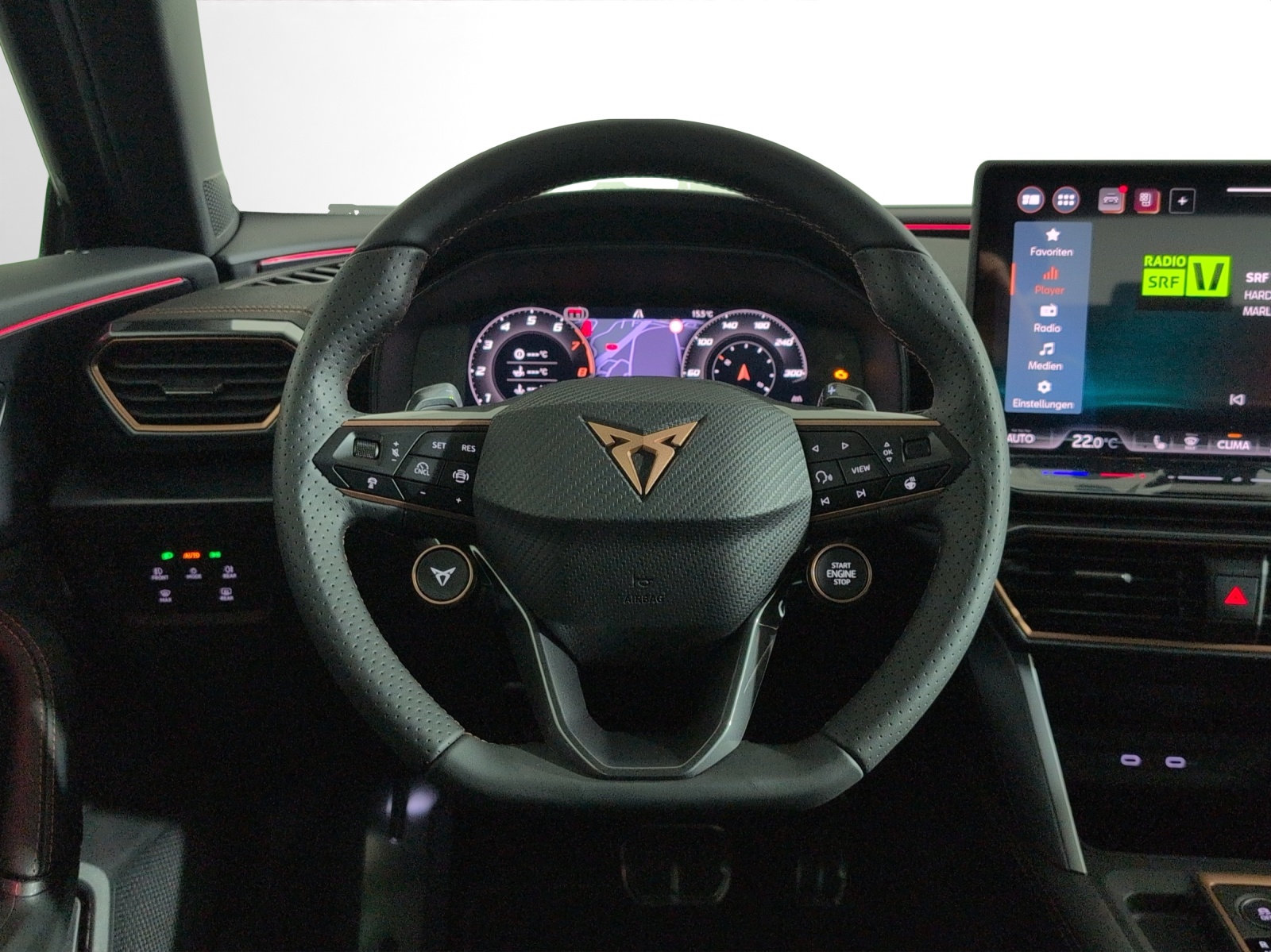 Serienausstattung 3-Punkt-Sicherheitsgurte auf allen Plätzen ABS, EBV elektronische Bremskraft-verteilung Abgedunkelte Scheiben ab B-Säule hinten Airbag: Airbag Beifahrer deaktivierbar Airbag: Airbag Fahrer und Beifahrer Airbag: Kopfairbags vorne und hinten Airbag: Seitenairbags für Fahrer und Beifahrer Assist: Aufmerksamkeits- und Müdigkeitserkennung (ADA) Assist: Ausweichunterstützung / Abbiegeassistent Assist: Automatische Distanzregelung ACC Assist: City Notbremsfunktion Assist: Elektronische Parkbremse mit Auto Hold Funktion Assist: Lane assist (Spurhalteassistent) Assist: Multifunktionskamera Assist: Multikollisionsbremse Assist: Prädiktive Speedlimiter Assist: Regen-/Lichtsensor Assist: Traction Control (TCS) Assist: Traffic sign recognition (Verkehrszeichenerkennung) Assist: Umfeldbeobachtung Front-Assist Auspuffanlage mit 4 Endrohren in Copper Aussenspiegel mit Beifahrerspiegelabsenkung Aussenspiegel mit LED-Umfeldbeleuchtung Automatisch abblendender Innenrückspiegel Beleuchtete Sonnenblende links mit abdeckbarem Spiegel und Lasche, rechts mit abdeckbarem Spiegel CUPRA Lettering in Dark Chrome ESC mit EBA, DSR, XDS und Reifendruckkontrolle Elektrische Fensterheber vorne und hinten mit Komfortschaltung und Einklemmschutz Fahrwerk: Adaptive Fahrwerksregelung DCC Fahrwerk: Performance AKEBONO Bremssättel vorne und hinten Fahrwerk: Progressivlenkung Fussmatten vorne und hinten Garantie: Cupra 12 Jahre Gewährleistung gegen Karosserie-Durchrostung Garantie: Cupra 3 Jahre Lack-Gewährleistung Garantie: Cupra Garantie 2 Jahre ohne Kilometerbegrenzung Garantie: Cupra Hersteller-Garantieverlängerung für das 3., 4. und 5. Jahr / max.100000 km Heckscheiben-Wisch-/Waschanlage mit Intervall Kindersitzverankerung ISOFIX (äussere Plätze hinten) Klima: 3-Zonen Climatronic mit Fondraumbedienung Lackierung: Metallic-Lackierung Lenkrad: Supersportlenkrad mit Start-/ Drive Profile-Knopfsystem und Schaltwippen, beheizbar Licht: Coming-home-Funktion Licht: Drittes Bremslicht Licht: Durchgehende Full LED-Heckleuchten Licht: Fernlicht-Assistent Licht: LED Heckleuchten mit beleuchtetem 3D CUPRA Logo Licht: LED-Heckleuchten mit dynamischem Blinklicht Licht: LED-Nebelscheinwerfer mit Cornering-Funktion Licht: Leuchtweitenregulierung dynamisch Licht: Nebelschlussleuchte Media: 12,9" Infotainment (MIB3) Media: 2 USB C Anschlüsse hinten und vorne Media: CUPRA Connect Online Infotainment Media: CUPRA Connect Remote & Access Media: CUPRA Connect Safety & Services Media: CUPRA Connectivity Box Media: CUPRA Navigationssystem 12.9" Infotainment Media: DAB+ (Digital Audio Broadcasting) Media: IMMERSIVE by SENNHEISER Media: Mobiltelefon Freisprechanlage Bluetooth Pedalen in Dark Aluminium Pyrotechnische Gurtstraffer und Gurtkraftbegrenzer Räder: Alufelgen 8,5J X 20", Machined in Copper Räder: Reifendruckkontrollsystem Räder: Reifenreparatur-Set (Tire Fit) Servolenkung mit geschwindigkeitsabhängiger Lenkkraftunterstützung Sitze: 3 verstellbare Kopfstützen hinten Sitze: Geteilt abklappbare Rücksitzlehne 1/3 - 2/3 Sitze: Kopfstützen vorne (integrierte) Sitze: Mittelarmlehne hinten Sitze: Mittelarmlehne vorne Sitze: Sitzheizung für Vordersitze, getrennt regelbar Sitze: Vordersitze höhenverstellbar mit Lendenwirbelstütze Stopp - Start- und Rekuperationssystem Wegfahrsperre elektronisch Zentralverriegelung mit Funkfernbedienung, 2 Funkschlüssel