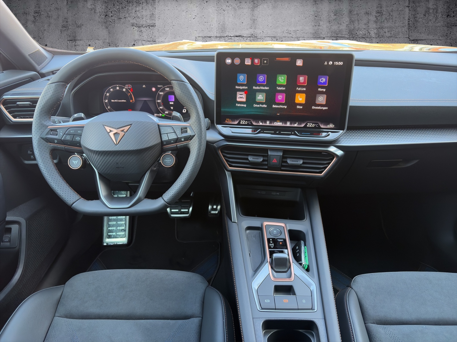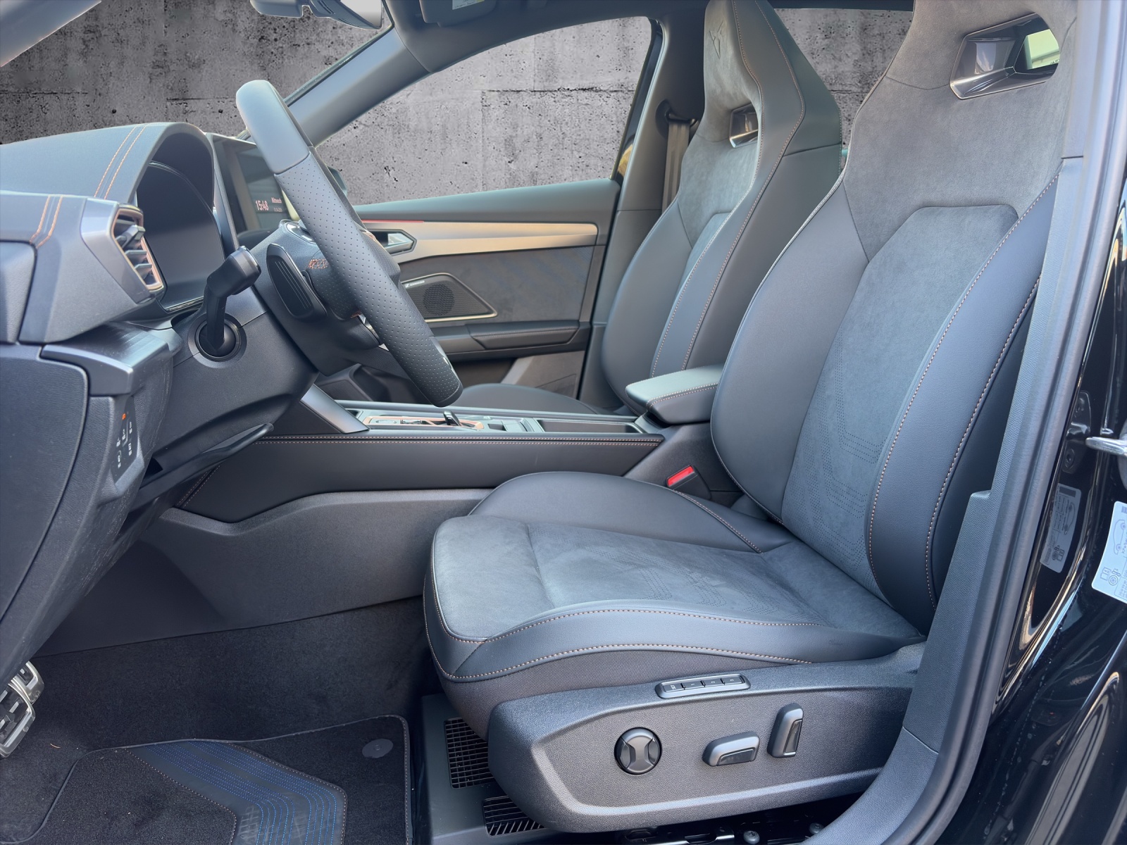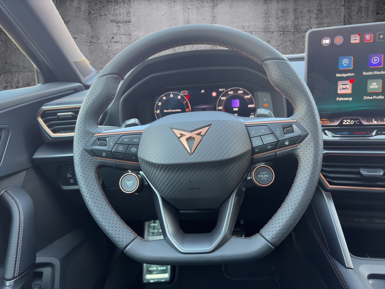 3-Punkt-Sicherheitsgurte auf allen Plätzen ABS, EBV elektronische Bremskraft-verteilung Abgedunkelte Scheiben ab B-Säule hinten Airbag: Airbag Beifahrer deaktivierbar Airbag: Airbag Fahrer und Beifahrer Airbag: Kopfairbags vorne und hinten Airbag: Seitenairbags für Fahrer und Beifahrer Assist: Aufmerksamkeits- und Müdigkeitserkennung (ADA) Assist: Ausweichunterstützung / Abbiegeassistent Assist: Automatische Distanzregelung ACC Assist: City Notbremsfunktion Assist: Einparkhilfe vorne und hinten mit Rückfahrkamera Assist: Elektronische Parkbremse mit Auto Hold Funktion Assist: Lane assist (Spurhalteassistent) Assist: Multifunktionskamera Assist: Multikollisionsbremse Assist: Prädiktive Speedlimiter Assist: Regen-/Lichtsensor Assist: Traction Control (TCS) Assist: Traffic sign recognition (Verkehrszeichenerkennung) Assist: Umfeldbeobachtung Front-Assist Aussenspiegel mit Beifahrerspiegelabsenkung Aussenspiegel mit LED-Umfeldbeleuchtung Automatisch abblendender Innenrückspiegel Beleuchtete Sonnenblende links mit abdeckbarem Spiegel und Lasche, rechts mit abdeckbarem Spiegel ESC mit EBA, DSR, XDS und Reifendruckkontrolle Elektrische Fensterheber vorne und hinten mit Komfortschaltung und Einklemmschutz Fahrwerk: Adaptive Fahrwerksregelung DCC Fahrwerk: Progressivlenkung Fussmatten vorne und hinten Garantie: Cupra 12 Jahre Gewährleistung gegen Karosserie-Durchrostung Garantie: Cupra 3 Jahre Lack-Gewährleistung Garantie: Cupra Garantie 2 Jahre ohne Kilometerbegrenzung Garantie: Cupra Hersteller-Garantieverlängerung für das 3., 4. und 5. Jahr / max.100000 km Heckscheiben-Wisch-/Waschanlage mit Intervall Kindersitzverankerung ISOFIX (äussere Plätze hinten) Klima: 3-Zonen Climatronic mit Fondraumbedienung Lackierung: Uni-Lackierung Lenkrad: Supersportlenkrad mit Start-/ Drive Profile-Knopfsystem und Schaltwippen, beheizbar Licht: Coming-home-Funktion Licht: Drittes Bremslicht Licht: Durchgehende Full LED-Heckleuchten Licht: Fernlicht-Assistent Licht: LED Heckleuchten mit beleuchtetem 3D CUPRA Logo Licht: LED-Heckleuchten mit dynamischem Blinklicht Licht: LED-Nebelscheinwerfer mit Cornering-Funktion Licht: Leuchtweitenregulierung dynamisch Licht: Nebelschlussleuchte Media: 12,9" Infotainment (MIB3) Media: 2 USB C Anschlüsse hinten und vorne Media: CUPRA Connect Online Infotainment Media: CUPRA Connect Remote & Access Media: CUPRA Connect Safety & Services Media: CUPRA Connectivity Box Media: CUPRA Navigationssystem 12.9" Infotainment Media: DAB+ (Digital Audio Broadcasting) Media: IMMERSIVE by SENNHEISER Media: Mobiltelefon Freisprechanlage Bluetooth Pyrotechnische Gurtstraffer und Gurtkraftbegrenzer Räder: Alufelgen 8J x 19", "SANDSTORM" Machined in Silver Räder: Reifendruckkontrollsystem Räder: Reifenreparatur-Set (Tire Fit) Servolenkung mit geschwindigkeitsabhängiger Lenkkraftunterstützung Sitze: 3 verstellbare Kopfstützen hinten Sitze: Geteilt abklappbare Rücksitzlehne 1/3 - 2/3 Sitze: Kopfstützen vorne (integrierte) Sitze: Mittelarmlehne hinten Sitze: Mittelarmlehne vorne Sitze: Sitzheizung für Vordersitze, getrennt regelbar Sitze: Vordersitze höhenverstellbar mit Lendenwirbelstütze Stopp - Start- und Rekuperationssystem Wegfahrsperre elektronisch Zentralverriegelung mit Funkfernbedienung, 2 Funkschlüssel