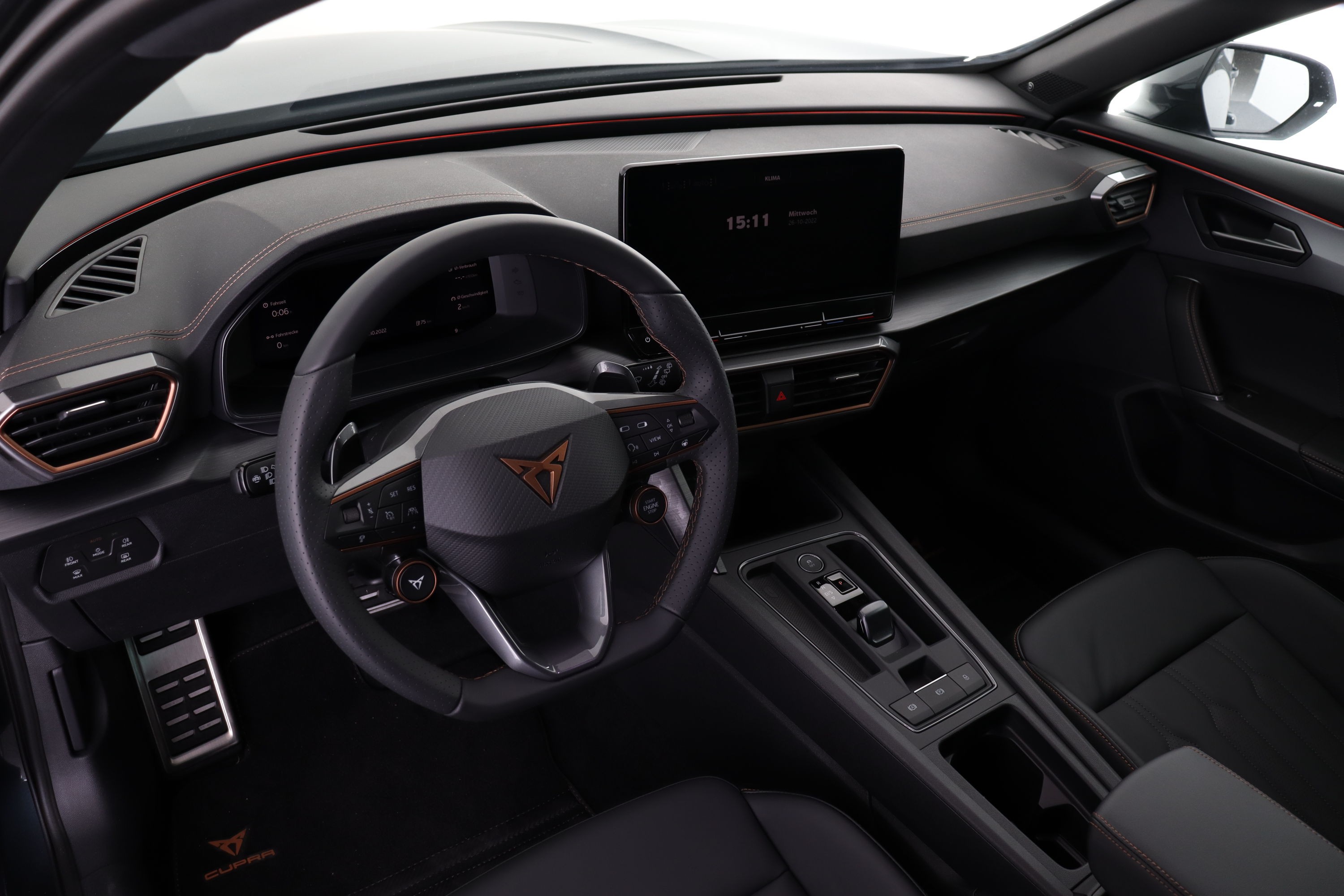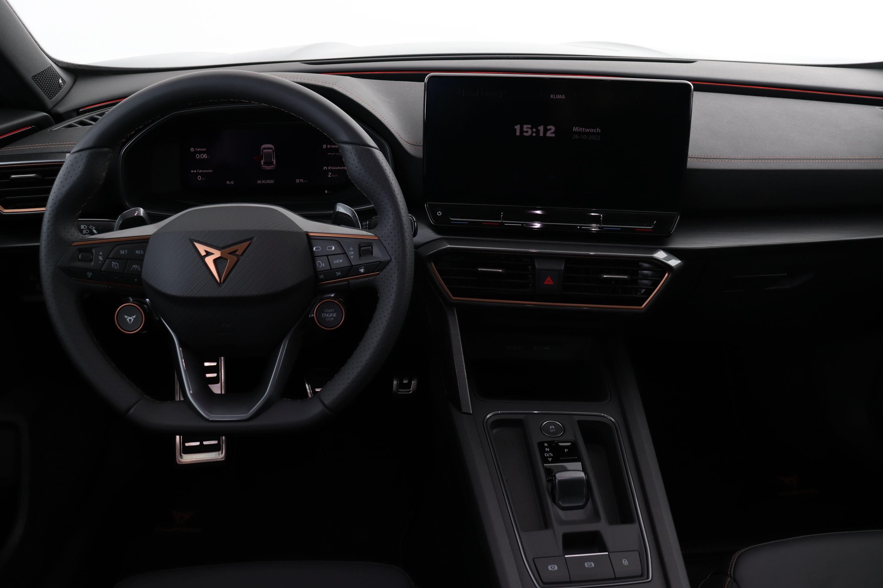 230-Volt Steckdose im Kofferraum und 12-Volt Steckdose in der Mittelkonsole ABS, EBV elektronische Bremskraft-verteilung Abgedunkelte Scheiben ab B-Säule hinten Airbag: Airbag Beifahrer deaktivierbar Airbag: Airbag Fahrer und Beifahrer Airbag: Kopfairbags vorne und hinten Airbag: Seitenairbags für Fahrer und Beifahrer Assist: City Notbremsfunktion Assist: Elektronische Parkbremse mit Auto Hold Funktion Assist: Multifunktionskamera Assist: Multikollisionsbremse Assist: Parklenkassistent Assist: PreCrash Sicherheitssystem Assist: Regen-/Lichtsensor Assist: Tiredness detection (Müdigkeitserkennung) Assist: Umfeldbeobachtung Front-Assist Aussenspiegel elektrisch einstell-, beheiz- und einklappbar Aussenspiegel mit Beifahrerspiegelabsenkung Aussenspiegel mit LED-Umfeldbeleuchtung Automatisch abblendender Innenrückspiegel Beleuchtete Sonnenblende links mit abdeckbarem Spiegel und Lasche, rechts mit abdeckbarem Spiegel CUPRA Drive Profile mit "driving experience button" Comfort, Sport, CUPRA, Individual, Snow, Offroad Dreipunkt-Automatiksicherheitsgurte auf allen Plätzen ESC mit EBA, DSR, XDS und Reifendruckkontrolle Elektrische Fensterheber vorne und hinten mit Komfortschaltung und Einklemmschutz Fahrwerk: Adaptive Fahrwerksregelung DCC Fahrwerk: Progressivlenkung Fussmatten vorne und hinten Garantie: Cupra 12 Jahre Gewährleistung gegen Karosserie-Durchrostung Garantie: Cupra 3 Jahre Lack-Gewährleistung Garantie: Cupra Garantie 2 Jahre ohne Kilometerbegrenzung Heckscheiben-Wisch-/Waschanlage mit Intervall Kindersitzverankerung ISOFIX (äussere Plätze hinten) Klima: 3-Zonen Climatronic mit Fondraumbedienung LED-Innenraumbeleuchtung mit Ambientebeleuchtung Wraparound Lackierung: Uni-Lackierung Lenkrad: Supersportlenkrad mit Start-/ Drive Profile-Knopfsystem und Schaltwippen, beheizbar Licht: Coming-home-Funktion Licht: Durchgehende Full LED-Heckleuchten Licht: LED-Heckleuchten mit dynamischem Blinklicht Licht: LED-Nebelscheinwerfer mit Cornering-Funktion Licht: LED-Scheinwerfer für Abblend- und Fernlicht Licht: Leuchtweitenregulierung dynamisch Media: 12" Infotainment (MIB3) Media: 2 USB C Anschlüsse hinten und vorne Media: CUPRA Connect Online Infotainment für Navigationssystem Media: CUPRA Connect Remote & Access für Navigationssystem Media: CUPRA Navigationssystem Media: DAB+ (Digital Audio Broadcasting) Media: Kartenmaterial ''Europa'' Media: Mobiltelefon Freisprechanlage Bluetooth Mittelarmlehne vorne und hinten Paket: Fahrerassistenzpaket XL für Navigationssystem Pyrotechnische Gurtstraffer und Gurtkraftbegrenzer Räder: Alufelgen 8J x 19", "EXCLUSIVE" 38/3 Machined Black Matt / Silver Räder: Ersatzrad platzsparend Räder: Reifendruck-Kontrollanzeige Schlüsselloses Schliess- und Startsystem (KESSY) Servolenkung mit geschwindigkeitsabhängiger Lenkkraftunterstützung Sitze: 2 verstellbare Kopfstützen vorne und 3 hinten Sitze: CUPRA Sport Schalensitze in "Sharp Textil schwarz" Sitze: Easy Backseat Release (Rücksitzentriegelung im Kofferraum) Sitze: Geteilt abklappbare Rücksitzlehne 1/3 - 2/3 Sitze: Vordersitze höhenverstellbar mit Lendenwirbelstütze Sportauspuffanlage mit 4-fach Endrohr Stopp - Start- und Rekuperationssystem Wegfahrsperre elektronisch Zentralverriegelung mit Funkfernbedienung, 2 Funkschlüssel