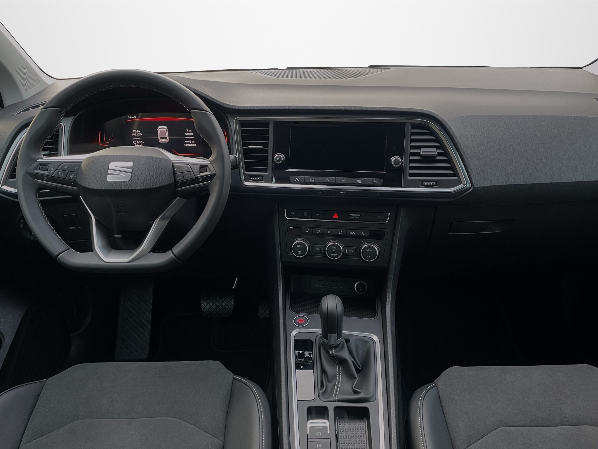 3-Punkt-Sicherheitsgurte auf allen Plätzen ABS, EBD elektronische Bremskraftverteilung Airbag: Beifahrerairbag deaktivierbar Airbag: Fahrer und Beifahrer Airbag Airbag: Knie-Airbag für Fahrer Airbag: Kopfairbags vorne und hinten Airbag: Seitenairbag für Fahrer und Beifahrer Assist: Aufmerksamkeits- und Müdigkeitserkennung (ADA) Assist: Auto-Hold-Funktion Assist: Automatische Parkbremse Assist: City Notbremsfunktion Assist: Fussgänger Notbremsfunktion Assist: Lane Assist (Spurhalteassistent) Assist: Multifunktionskamera Assist: Multikollisionsbremse Assist: Parklenkassistent Assist: Traction Control (TCS) Assist: Traffic sign recognition (Verkehrszeichenerkennung) Assist: Umfeldbeobachtung 'Front-Assist' Aussenspiegel in Wagenfarbe Aussenspiegel mit Beifahrerspiegelabsenkung Aussenspiegel rechts und links beheizt, elektrisch verstell-/ und einklappbar Bordcomputer MEDIUM (Farbdisplay) Dokumentenablage unter dem linken Vordersitz Elektrische Fensterheber vorne und hinten mit Komfortschaltung und Einklemmschutz Elektronische Differentialsperre (XDS) Elektronisches Stabilitäts-Programm Getriebe: 7-Gang-Sequentielle-Getriebe mit Automatikfunktion Gurte Höhenverstellbar vorne Heckscheiben-Wisch-Waschanlage mit Intervall ISOFIX Kindersitzvorrichtung Innenspiegel automatisch abblendbar Klima: 2-Zonen-Klimaautomatik Kopfstützen vorne höhenverstellbar Lackierung: Uni-Lackierung Lenkrad: Lenkrad mit Schaltwippen Lenkrad: Sport-Multifunktionslenkrad in Leder Licht: Bremslicht Drittes Licht: Coming-home-Funktion Licht: LED-Heckleuchten mit dynamischem Blinklicht Licht: LED-Nebelscheinwerfer mit Abbiegelicht Licht: LED-Scheinwerfer für Abblend- und Fernlicht Licht: Leuchtweitenregulierung dynamisch Licht: Nebelschlussleuchte Media: DAB+ (Digital Audio Broadcasting) Media: Mobiltelefon Freisprecheinrichtung Bluetooth Media: SEAT Connect Safety & Services für Media System Media: SEAT Full Link für Mediasystem Paket: Fahrerassistenzpaket M für Media System Pollenfilter (Staubfilter) Polster: Stoff-Ausstattung Räder: Leichtmetallräder 7J x 17", "DYNAMIC" Räder: Reifendruck-Kontrollanzeige Räder: Reifenreparatur-Set (Tire Fit) SEAT Garantie: Garantie 12 Jahre Gewährleistung gegen Karosserie-Durchrostung SEAT Garantie: Garantie 2 Jahre ohne Kilometerbegrenzung (ab 1. Inv.) SEAT Garantie: Garantie 3 Jahre Lack-Gewährleistung Scheibenwischer vorne mit Intervall Servolenkung geschwindigkeitsabhängig Sitze: Lendenwirbelstütze vorne manuell Sitze: Mittelarmlehne hinten Sitze: Mittelarmlehne vorne Sitze: Rücksitzentriegelung im Kofferraum Sitze: Rücksitzlehne geteilt abklappbar Sitze: Vordersitze höhenverstellbar Sonnenblende Fahrer und Beifahrerseite mit beleuchtetem Spiegel Staufach unter den Vordersitzen Teppichfussmatten vorne und hinten USB C Anschlüsse hinten 2x USB C Anschlüsse vorne 2x Wegfahrsperre elektronisch Zentralverriegelung mit Funkfernbedienung, 2 Funkschlüssel