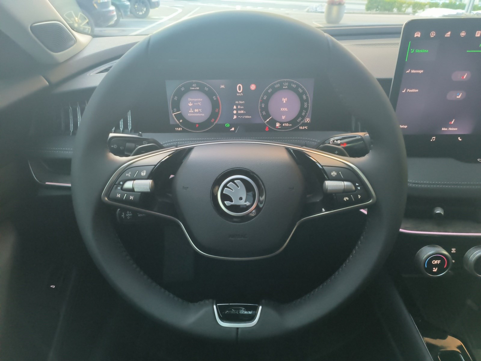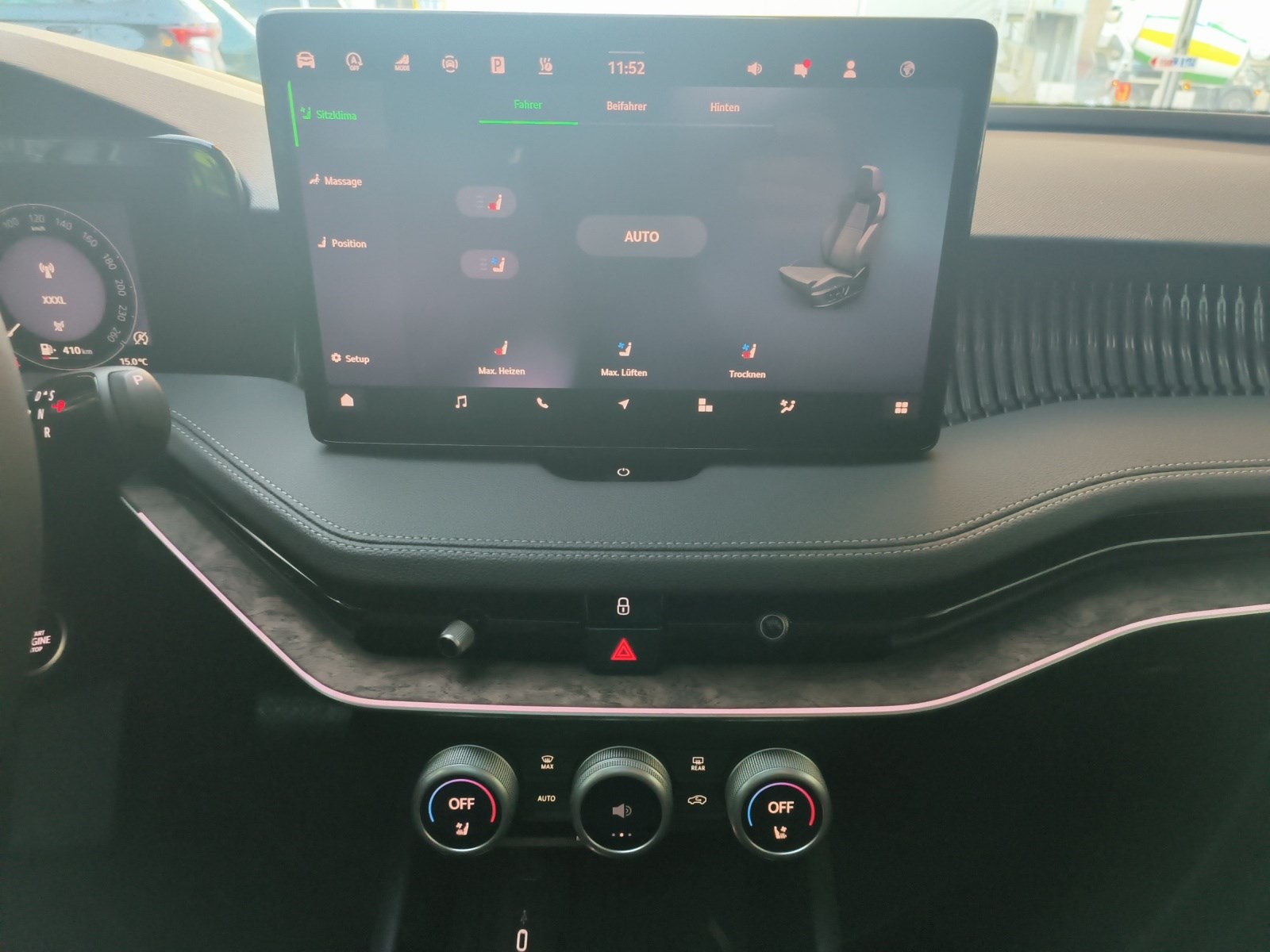 3-Punkt-Sicherheitsgurte auf allen Plätzen ABS, EBD elektronische Bremskraftverteilung Ablagekasten im Kofferraum mit Deckel in der Seitenverkleidung (links und rechts) Airbag: Airbag Beifahrer deaktivierbar Airbag: Airbag Fahrer und Beifahrer Airbag: Knie-Airbag für Fahrer Airbag: Kopfairbags inkl. Seitenairbags vorne Airbag: Zentralairbag vorne Assist: Abbiegeassistent mit Gegenverkehr Warnung Assist: Ablenkungs- und Müdigkeitserkennung Assist: Adaptive Geschwindigkeitsregelanlage "Adaptive Cruise Control" Assist: Adaptiver Spurhalteassistent "Lane Assist" mit Stau- und Notbremsassistent Assist: Berganfahrassistent Assist: Emergency Call (Notruf) Assist: Insassenschutzsystem "Crew Protect Assistant" vorne, hinten und auf beiden Seiten Assist: Kreuzungsassistent mit Querverkehrserkennung von Fahrzeugen und Fussgänger Assist: Notbremsassistent "Front Assist" Assist: Parksensoren vorne und hinten Assist: Regensensor mit Lichtassistent (Coming Home, Leaving Home, Tunnel Light) Assist: Spurwechselassistent "Side Assist" inkl. Ausparkassistent und Ausstiegswarnung Assist: Verkehrszeichenerkennung Aussenspiegel rechts und links beheizbar und elektrisch verstellbar Design Selection Suite L&K Schwarz: Elektrische Fensterheber vorne + hinten mit Einklemmschutz Elektrische Kindersicherung Elektronisches Stabilitäts-Programm (ESP) Heckscheiben-Wisch-/Waschanlage Innenspiegel automatisch abblendbar Klima: Klimaanlage "Climatronic", 3-Zonen-Temperaturregelung, vollautomatisch, getrennt regelbar Lackierung: Uni-Lackierung Lenkrad: 2-Speichen-Leder-Multifunktionslenkrad mit Schaltwippen Media: SmartLink (CarPlay und Android Auto) Media: Soundsystem CANTON Paket: Assisted Drive Paket Paket: Infotainment 13" Basic Paket: Licht und Sicht Paket Phonebox und Wireless Charging Räder: Leichtmetallräder 8,0 J x 18" "Belatrix", antrazit mit polierter Oberfläche Räder: Reifendruckkontrollsystem Räder: Stahlnotrad platzsparend inkl. Wagenheber und Radschraubenschlüssel (ohne Pannenset) SKODA Garantie: Anschlussgarantie 2+1 Jahre (total 3 Jahre), max. 100.000 km SKODA Garantie: Garantie 12 Jahre gegen Durchrostungs (ab 1. Inv.) SKODA Garantie: Garantie 3 Jahre gegen Lackschäden (ab 1. Inv.) SKODA Garantie: Neuwagen-Garantie: 2 Jahre ohne Kilometerbegrenzung Sitze: 3 Kopfstützen hinten Sitze: Rücksitzbank ungeteilt, Rücksitzlehne geteilt umklappbar Sitze: Vorbereitung für Kindersitzhalterung mit Sicherheitssystem ISOFIX auf dem Beifahrersitz Sitze: Vordersitze heizbar Sitze: Vordersitze mit Lendenwirbelstützen, pneumatisch Vorbereitung für Anhängerkupplung Wegfahrsperre elektronisch Zentralverriegelung mit Fernbedienung