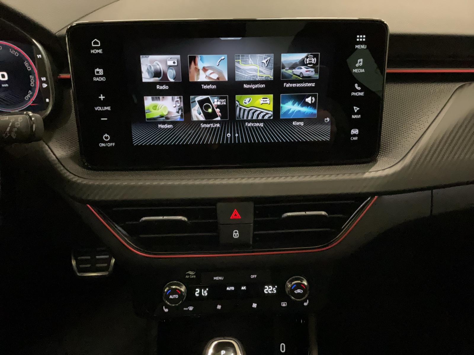 3-Punkt-Sicherheitsgurte auf allen Plätzen Airbag: Airbag Beifahrer deaktivierbar Airbag: Airbag Fahrer und Beifahrer Airbag: Kopf- und Seitenairbags vorne Ambiente Beleuchtung 2-farbig Assist: Ablenkungs- und Müdigkeitserkennung Assist: Berganfahrassistent Assist: Geschwindigkeitsregelanlage (Tempomat) Assist: Notbremsassistent "Front Assist" Assist: Parksensoren hinten Assist: Spurhalteassistent "Lane Assist" Assist: Verkehrszeichenerkennung Aussenspiegel rechts und links beheizbar und elektrisch verstellbar ESC (Elektronische Stabilisierungskontrolle) mit Multikollisionsbremse, ABS und ASR Elektrische Fensterheber vorne + hinten Fahrprofilauswahl "Driving Mode Selection" Gurtanlegesignalisation für alle Passagiere Heckscheiben-Wisch-/Waschanlage Innenspiegel automatisch abblendbar Klappbare Gepäckhaken im Kofferraum Klima: Klimaanlage "Climatronic", 2-Zonen-Temperaturregelung, vollautomatisch, getrennt regelbar Kühlergrill mit Chromzierrand Lackierung: Uni-Lackierung Lenkrad: 3-Speichen-Sport-Leder-Multifunktionslenkrad mit Schaltwippen Lenkrad: 3-Speichen-Sport-Leder-Multifunktionslenkrad mit Schaltwippen (DSG), beheizbar und HOD Licht: Easy Light Assist (automatische Lichtschaltung, Coming Home, Leaving Home) Media: 2 USB-C Anschlüsse im Fond Media: 2 USB-C Anschlüsse vorne Media: 4 USB- C Anschlüsse Media: 4 zusätzliche Lausprecher hinten Media: Bluetooth Freisprechanlage Media: DAB+ (Digital Audio Broadcasting) Media: Infotainment Online 3 Jahre + "Care Connect" (Remote Access 3 Jahre) Media: Skoda Infotainment 8.25" Media: SmartLink (CarPlay und Android Auto) Media: Telefonvorbereitung mit Bluetooth Media: Wireless Smartlink Mittelarmlehne hinten mit Doppel Getränkehalter und ohne Durchladefunktion Paket: Light and View Plus Paket Polster: Sportsitzbezüge Stoff schwarz, teilweise Carbon-Optik und roten und grauen Streifen Räder: Leichtmetallräder 6,5 J x 17" "Kajam Aero", schwarz mit schwarzer Aero-Blende Räder: Pannenset (Kompressor und Flasche mit Dichtmittel, ohne Reserverad) Räder: Reifendruckkontrollsystem SKODA Garantie: Anschlussgarantie 1 Jahr, max. 100000 km SKODA Neuwagen-Garantie: 2 Jahre ohne Kilometerbegrenzung Seitliche Luftführungen im Stossfänger vorne schwarz lackiert Sitze: 3 Kopfstützen hinten Sitze: Mittelarmlehne vorne inkl. grosser Jumbo-Box Sitze: Rücksitzlehne geteilt umklappbar (60:40) Sitze: Vorbereitung für Kindersitzhalterung mit Sicherheitssystem ISOFIX auf dem Beifahrersitz Sitze: Vordersitze höhenverstellbar Türgriffe aussen in Wagenfarbe Wegfahrsperre elektronisch