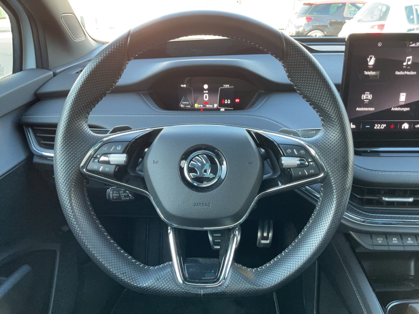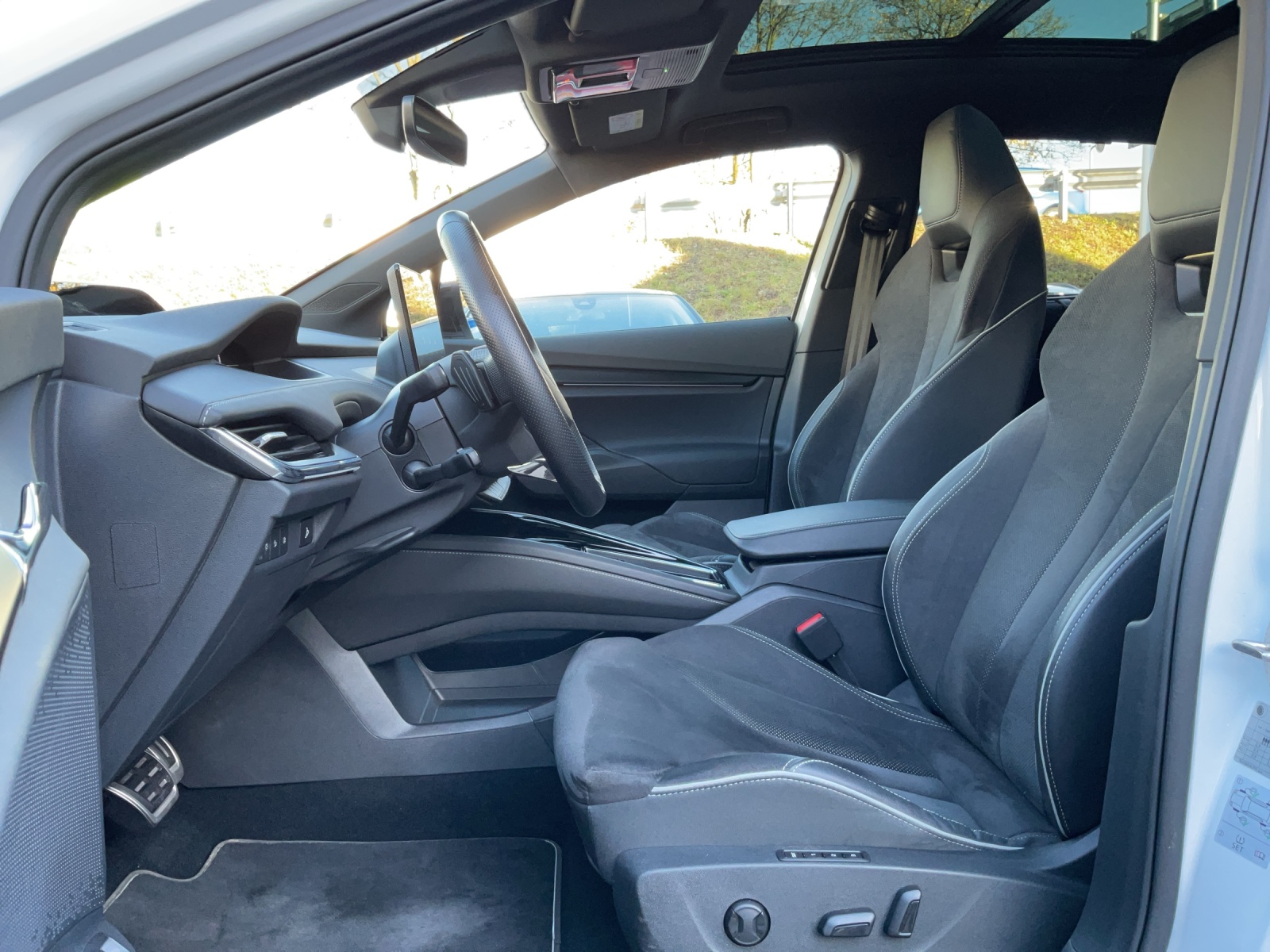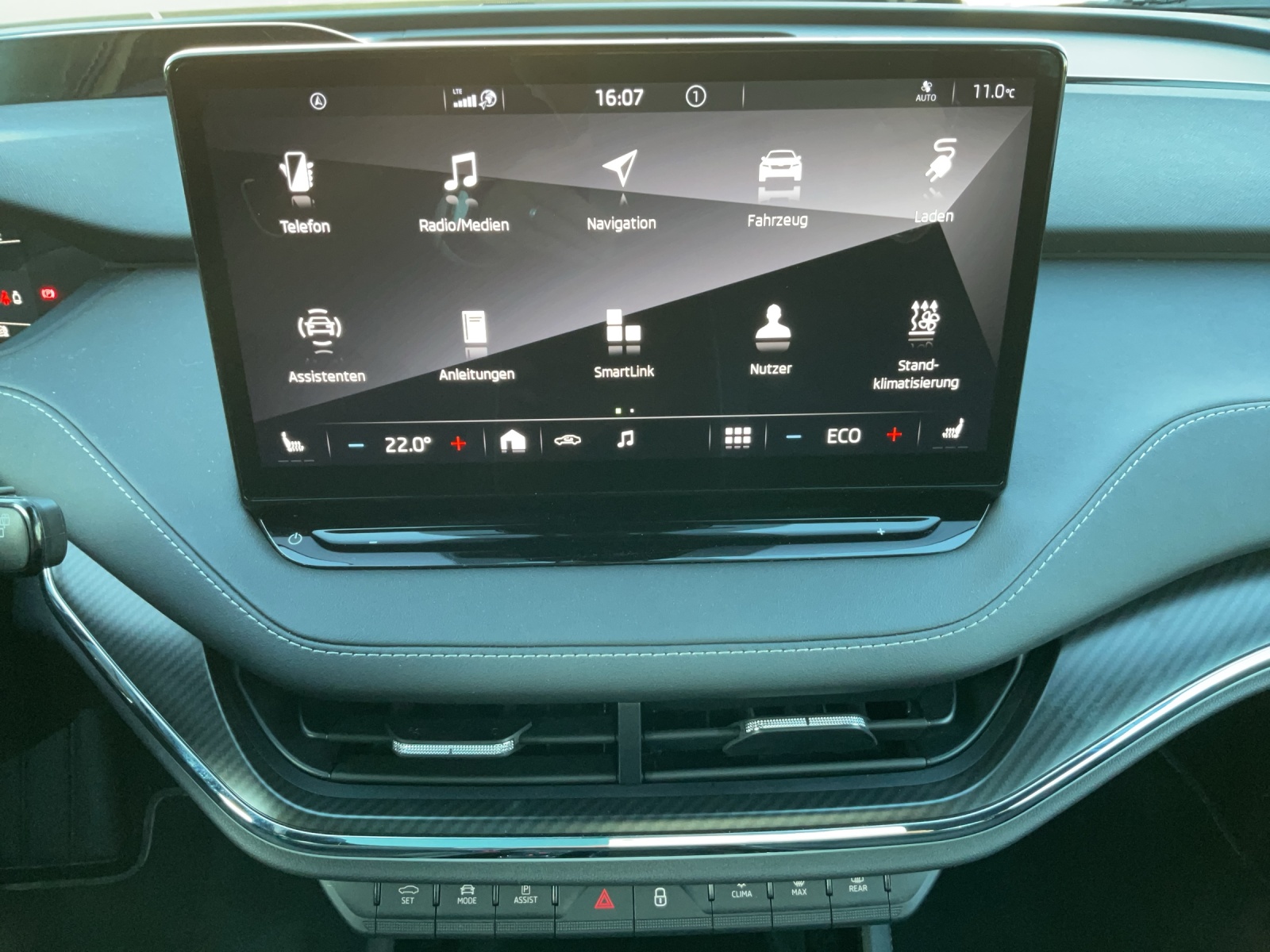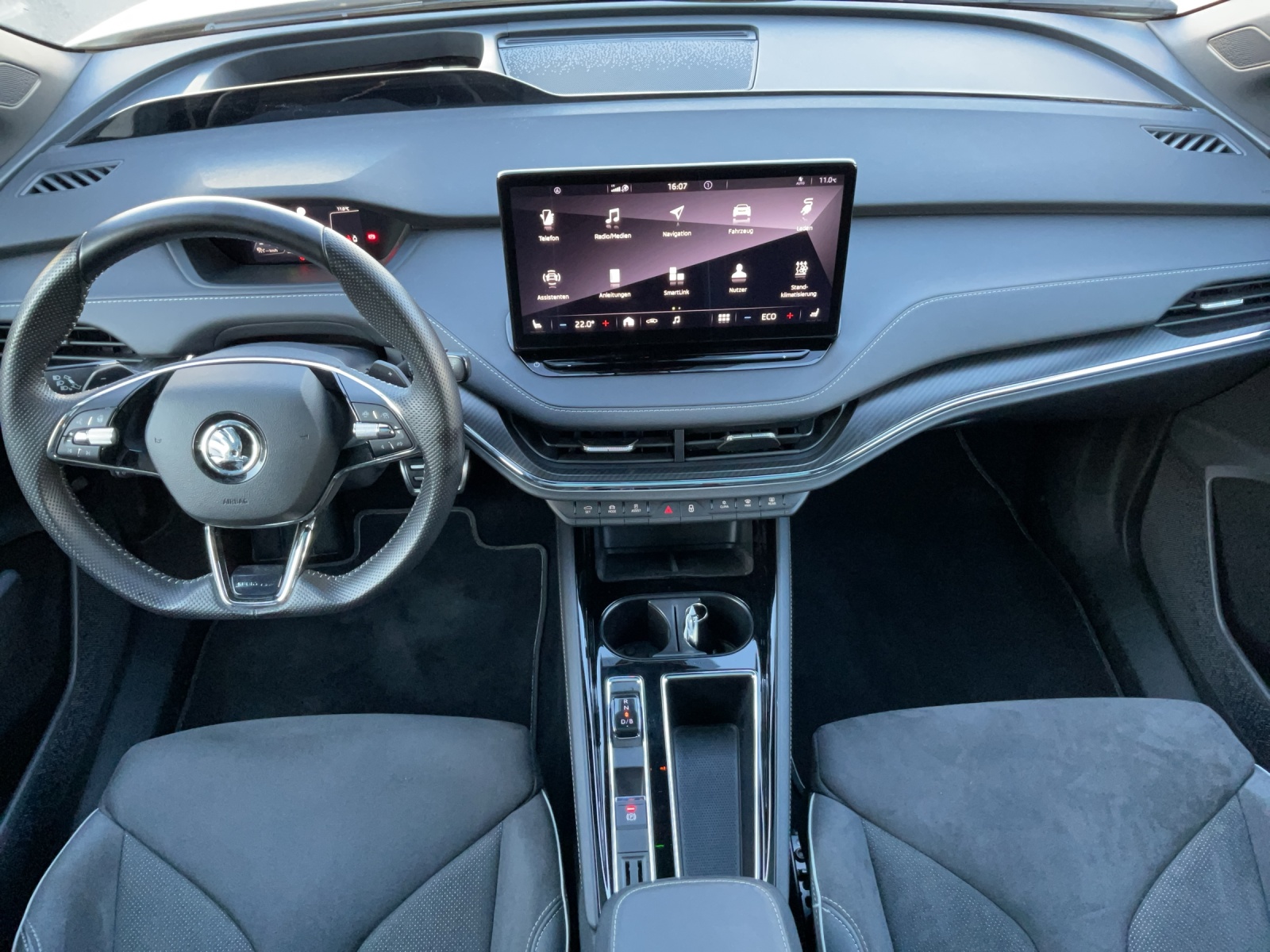 12 Volt-Steckdose im Laderaum 3-Punkt-Sicherheitsgurte auf allen Plätzen AC Batterieladung bis 11 kW Ablagekästen im Kofferraum (mit Steckdeckel links + rechts, ohne Kargoelementen) Airbag: Fahrer- und Beifahrerairbag Airbag: Seitenairbag vorne mit Kopfairbag und Mittelairbag vorne Akustisch optimierte Windschutzscheibe aus wärmedämmendem Glas Ambiente- und Fussraumbeleuchtung vorne und hinten,mehrfarbig Assist: Front Assistant inkl. City-Notbremsfunktion Assist: Geschwindigkeitsregelanlage (Tempomat) Assist: Notrufsystem Emergency-Call Assist: Regensensor mit Lichtassistent (Coming Home, Leaving Home, Tunnel Light) Assist: Spurhalteassistent "Lane Assist" Aussenspiegel automatisch abblendbar, elektrisch anklapp-/einstellbar Aussenspiegel mit Einstiegsbeleuchtung Boardwerkzeug und Reifenreparaturset DC Batterieladung bis 125 kW DC Batterieladung bis 50 kW Dachreling schwarz-lackiert Elektronisches Stabilitäts-Programm (ESP) Fussmatten vorne und hinten Getriebe: 1-Gang Getriebe Heckklappenöffnung manuell Heckscheibenwischer «AERO» Innenspiegel automatisch abblendbar KESSY- Go Schlüsselloses Startsystem Klima: Climatronic 2-Zonen-Temperaturregelung, vollautomatisch, getrennt regelbar Kühlerumrahmung schwarz hochglanz Ladekabel für AC-Normalladen bis zu 11 kW, Typ2-Stecker Licht: Basis LED Frontscheinwerfer inkl. LED Tagfahrlicht Licht: Leuchtweitenregulierung manuell Media: "Care Connect" iV Remote-Dienste Media: DAB+ (Digital Audio Broadcasting) Media: SmartLink (CarPlay und Android Auto) Media: Telefonvorbereitung mit Bluetooth Media: USB-C-Anschluss vorne, Laden und Daten Media: Vorbereitung für Navigationssystem Mittelkonsole mit Armlehne On-Board Batterieladefähigkeit 11kW für AC (3-Phase) Paket: Convenience Basic- Paket: Drive Sport Basic- Paket: Licht & Sicht Basic Pollenfilter (Staubfilter) Polster: SportLine Sitzbezüge Suedia/Leder mit grauer Naht, Dekor Carbon Regenschirm in der Vordertür Räder: Leichtmetallräder 20" (8 J vorn, 9 J hinten) "VEGA SPORTLINE", Anthrazit glanzgedreht Räder: Reifendruckkontrollsystem SKODA Garantie: Garantie 12 Jahre gegen Durchrostungs (ab 1. Inv.) SKODA Garantie: Garantie 2 Jahre ohne Kilometerbegrenzung (ab 1. Inv.) SKODA Garantie: Garantie 3 Jahre gegen Lackschäden (ab 1. Inv.) SKODA Garantie: Garantie 8 Jahre oder 160’000 km Garantie auf HV-Batterie Servolenkung, geschwindigkeitsabhängig (Servotronic) Sitze: 3. Kopfstütze hinten Sitze: Isofix an Rücksitzen und Beifahrersitz und 2 x TopTether Sitze: Rücksitzbank, 60:40 geteilt umklappbare Rückenlehne, mit Mittelarmlehne Sitze: Sport-Komfortsitze vorne Sitze: Vordersitze höhenverstellbar (manuell) Sitze: Vordersitze mit Lendenwirbelstütze manuell anpassbar Sportliche Stossfänger und Diffusor Türschwellen und Zierleisten in schwarz Umrandung der Seitenscheiben in schwarz Wegfahrsperre elektronisch Wärmepumpe zur Reichweitenoptimierung Zentralverriegelung mit Fernbedienung