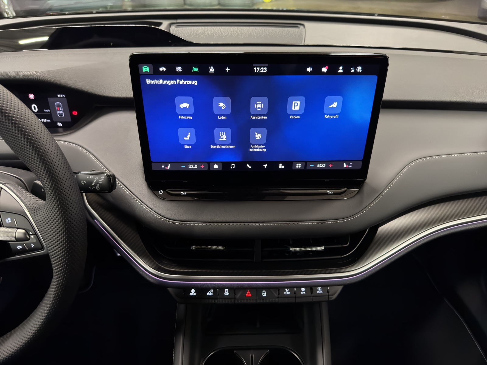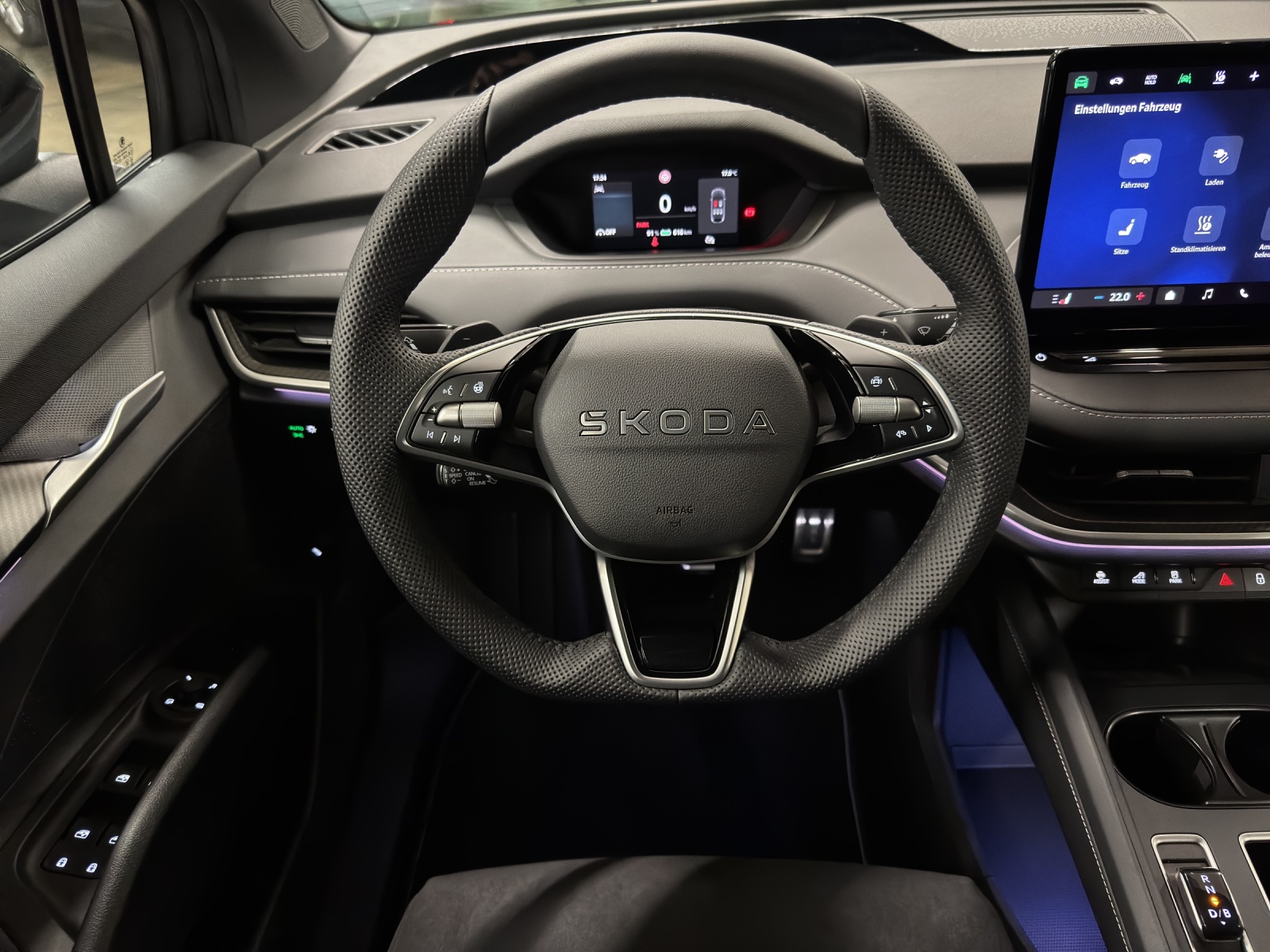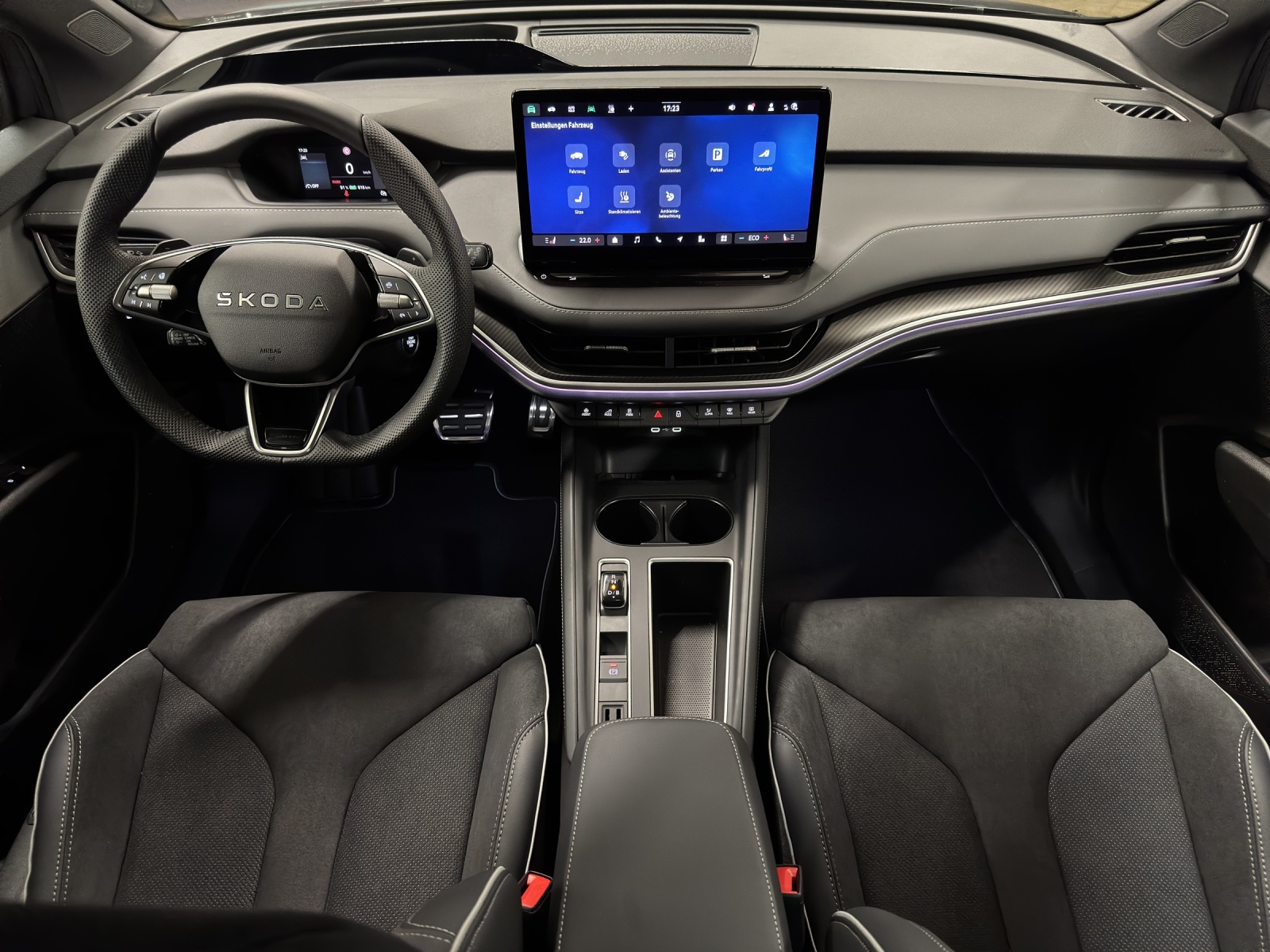 3-Punkt-Sicherheitsgurte auf allen Plätzen ABS, EBD elektronische Bremskraftverteilung AC Batterieladung bis 11 kW Ablagekasten im Kofferraum in der Seitenverkleidung (links und rechts) Airbag: Airbag Beifahrer deaktivierbar Airbag: Airbag Fahrer und Beifahrer Airbag: Kopf-, Seiten- und Zentralairbag vorne (zwischen Fahrer- und Beifahrersitz) Assist: Abbiegeassistent mit Gegenverkehr Warnung Assist: Ablenkungs- und Müdigkeitserkennung Assist: Adaptive Geschwindigkeitsregelanlage "Adaptive Cruise Control" Assist: Adaptiver Spurhalteassistent "Lane Assist" mit Stau- und Notbremsassistent Assist: Emergency Call (Notruf) Assist: Fahrassistent"Travel Assist 2.6"mit Geschwindigkeitsregelanlage"Predictive Cruise Control" Assist: Insassenschutzsystem "Crew Protect Assistant" vorne, hinten und auf beiden Seiten Assist: Notbremsassistent "Front Assist" Assist: Parksensoren vorne und hinten Assist: Prädiktive Geschwindigkeitswarnanlage Assist: Spurwechselassistent "Side Assist" Assist: Verkehrszeichenerkennung Aussenspiegel elektrisch anklappbar mit automatischer Abblendung (nur Fahrerseite) Aussenspiegel elektrisch einstell- und beheizbar DC Batterieladung bis 175 kW Dachreling schwarz hochglanz Design Selection Sportline Diebstahlalarmanlage, Innenraumüberwachung, Back-Up-Horn und Abschleppschutz Elektrische Fensterheber vorne + hinten Elektrische Kindersicherung Elektronisches Stabilitäts-Programm (ESP) Fahrprofilauswahl- "Driving Mode Selection" Fahrwerk: Progressivlenkung Fahrwerk: Sportfahrwerk (Bodenfreiheit Dämpfer vorne -15 mm, Dämpfer hinten -10 mm) Fenster Zierleisten in Schwarz hochglanz Getriebe: 1-Gang Getriebe Gurtanlegesignalisation für alle Passagiere Heckscheiben-Wisch-/Waschanlage mit Iinterval Innenspiegel automatisch abblendbar Kindersicherung manuell einstellbar Klima: Klimaanlage "Climatronic", 2-Zonen-Temperaturregelung, vollautomatisch, getrennt regelbar Kofferraumabdeckung, herausnehmbar Lackierung: Uni-Lackierung Ladekabel für AC-Normalladen bis zu 11 kW, Typ2-Stecker Lenkrad: Sport-Leder-Multifunktionslenkrad 3-Speichen mit Schaltwippen, beheizbar Licht: Basis LED Frontscheinwerfer inkl. LED Tagfahrlicht Media: 2 USB-C Anschlüsse vorne und hinten Media: DAB+ (Digital Audio Broadcasting) Media: Infotainment Online 3 Jahre + "Care Connect" (Remote Access [3 Jahr] und Proactive Services) Media: Infotainmentdisplay 13" Media: Navigationsfunktion Media: SmartLink (CarPlay und Android Auto) Media: Telefonvorbereitung mit Bluetooth Mittelkonsole mit Mittelarmlehne Phonebox und Wireless Charging Radlaufleisten nicht lackiert Räder: Leichtmetallräder 8 J x 20"/9 J x 20 "Vega" Schwarz mit polierter Oberfläche Räder: Pannenset (Kompressor und Flasche mit Dichtmittel, ohne Reserverad) Räder: Reifendruckkontrollsystem SKODA Garantie: Anschlussgarantie 1 Jahr, max. 100000 km SKODA Garantie: Garantie 12 Jahre gegen Durchrostungs (ab 1. Inv.) SKODA Garantie: Garantie 3 Jahre gegen Lackschäden (ab 1. Inv.) SKODA Garantie: Garantie 8 Jahre oder 160000 km Garantie auf HV-Batterie SKODA Garantie: Neuwagen-Garantie: 2 Jahre ohne Kilometerbegrenzung Schliess- und Startsystem schlüssellos mit Safelock "Kessy Advanced" (Keyless Access) Sitze: 3 Kopfstützen hinten Sitze: Lendenwirbelstütze in Vordersitzlehnen, manuell einstellbar Sitze: Rücksitzbank ungeteilt, Rücksitzlehne geteilt umklappbar Sitze: Vorbereitung für Kindersitzhalterung mit Sicherheitssystem ISOFIX auf dem Beifahrersitz Sitze: Vordersitze heizbar Sitze: Vordersitze höhenverstellbar (manuell) Vorbereitung für Anhängerkupplung Zentralverriegelung mit Fernbedienung