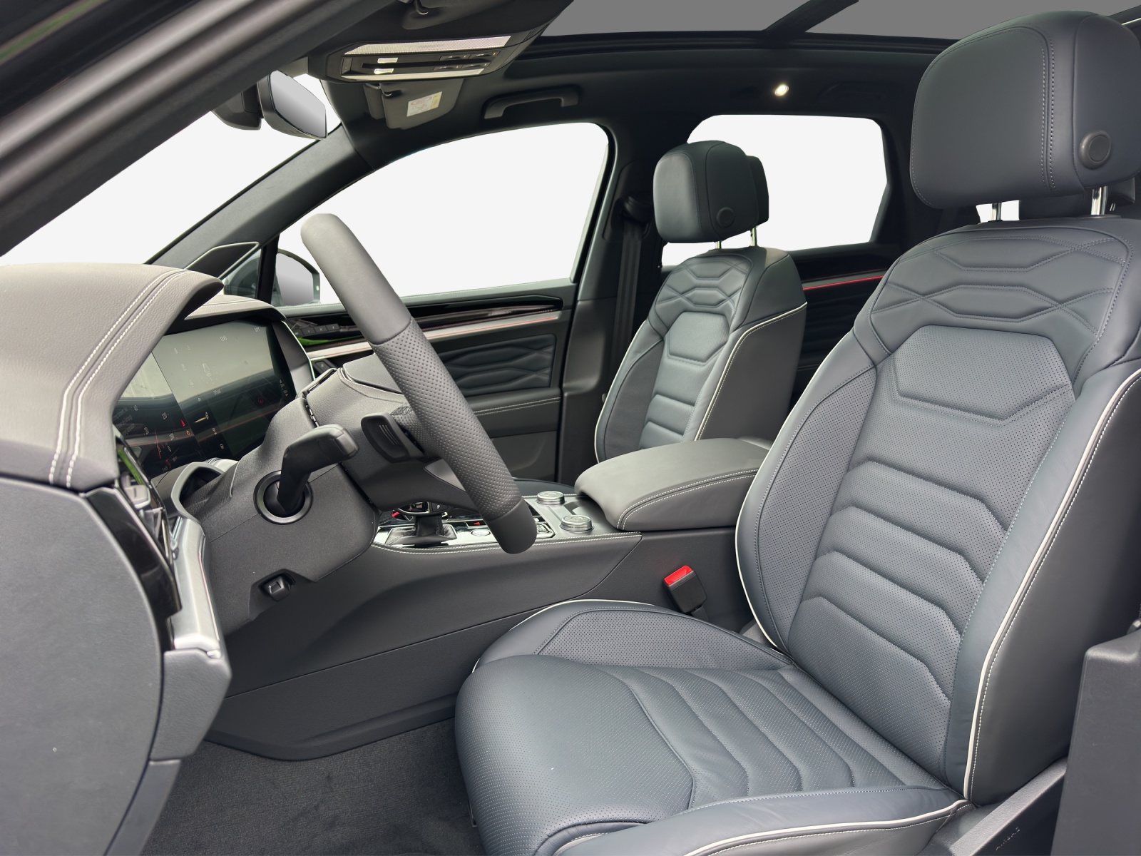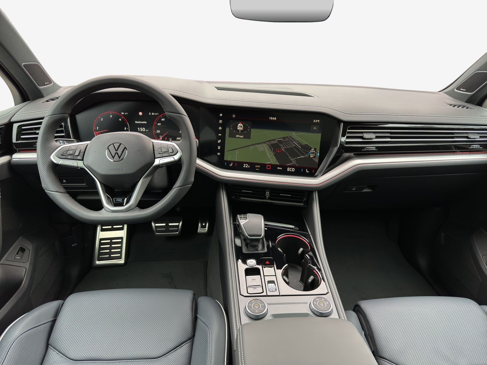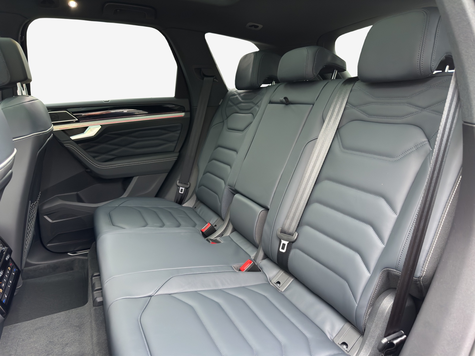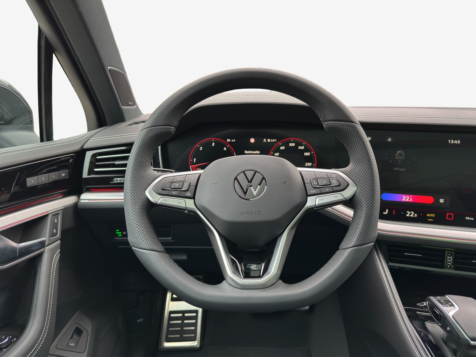 Sonderausstattung Airbag: Seitenairbags zusätzlich für die äusseren Rücksitze Anhängevorrichtung inkl. Anhängerrassistent 'Trailer Assist' Dekor: Dekoreinlagen in Aluminium Frontscheibe geräuschdämmend und beheizbar Klima: 4-Zonen-Klimaanlage "Air Care Climatronic" mit Bedienungselement hinten Lackierung: Metallic-/Perleffekt-Lackierungen Luftfahrwerk und Allradlenkung Media: Soundsystem Dynaudio Consequence Nachtsichtfunktion 'Night Vision' Paket: Ambientepaket farbig für R-Line Paket: Design & Comfort Paket für R-Line Paket: Fahrassistenzpaket "IQ Drive" inkl. Travel Assist Paket: Licht & Sicht-Paket für Memory-Pakete Paket: Parkassistenzpaket inkl. "Park Assist Pro" Paket: Technik Paket für Elegance und R-Line Panorama-Ausstell-/Schiebedach mit Panoramadach hinten Räder: Leichtmetallräder "Estoril" 9.5 J x 22, Volkswagen R, schwarz glanzgedreht Seitenscheiben hinten und Heckscheibe 82% abgedunkelt Sitze: Lederausstattung "Varenna" (Kombination aus Leder und hochwertigem Kunstleder) für R-Line, Sitze: Sitzheizung für äussere Sitze der 2. Sitzreihe Sitze: Vordersitze mit Massageprogrammen und aktiver Klimatisierung Zuziehhilfe elektrisch für Türen