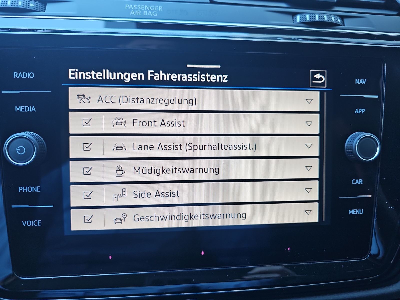 12-V- Steckdose im Gepäckraum 12-V-Steckdose an der Mittelkonsole hinten und im Gepäckraum 2 LED-Leseleuchten vorne und hinten 3 Dreipunkt-Automatiksicherheitsgurte hinten 4 Verzurrösen im Gepäckraum Ablagefach auf der Instrumententafel mit Deckel Ablagefächer in allen Türen (für 1,5-l-Flaschen vorn und 1-l-Flaschen hinten) Ablagefächer in der Dachkonsole Ablagefächer und Spannband im Gepäckraum Ablagefächer unterhalb der Instrumententafel Ablagenetz im Beifahrerfussraum Ablagetaschen an den Rückseiten der Vordersitze Airbag: Airbag Beifahrer deaktivierbar Airbag: Airbag Fahrer und Beifahrer Airbag: Knieairbag auf Fahrerseite Airbag: Kopfairbagsystem für Front- und Fondpassagiere inkl. Seitenairbags vorn Assist: Ablenkungs- und Müdigkeitserkennung Assist: Automatische Distanzregelung ACC bis 210 km/h und Umfeldbeobachtungssystem "Front Assist" Assist: Elektronische Parkbremse inkl. Auto-Hold-Funktion Assist: Elektronisches Stabilisierungsprogramm mit Gegenlenkunterstützung Assist: Fussgänger- und Radfahrererkennung sowie aktive Frontklappe Assist: Geschwindigkeitsbegrenzer Assist: Multifunktionskamera Assist: Multikollisionsbremse Assist: ParkPilot - akustische Warnsignale bei Hindernissen im Front- und Heckbereich Assist: Proaktives Insassenschutzsystem Assist: Rückfahrkamera Rear View Assist: Security & Service Plus inkl. Notruffunktion Assist: Spurhalteassistent Lane Assist Assist: Spurwechselassistent "Side Assist", Ausparkassistent und Heckradar Assist: Verkehrszeichenerkennung Aussenspiegel auf Fahrerseite asphärisch Aussenspiegel elektrisch anklappbar, Aussenspiegelgehäuse und Türgriffe in Wagenfarbe Blinkleuchten seitlich in die Aussenspiegel integriert Bordwerkzeug und Wagenheber Bremsbelag-Verschleissanzeige Chromleisten an den Seitenfenstern Dachpfostenverkleidung in Schwarz, glänzend Dekor: Ausströmer vorn, Lichtdrehschalter und Kombiinstrument mit Chromeinfassung Dekor: Dekoreinlagen "Piano Black" für Instrumententafel, Türverkleidungen vorn und Mittelkonsole Diebstahlwarnanlage Plus mit Safe-Lock Dreipunkt-Automatiksicherheitsgurte vorne mit Höheneinstellung und Gurtstraffer Elektronische Differentialsperre (XDS) Elektronisches Stabilisierungsprogramm (ESP) mit Gegenlenkunterstützung Fensterheber vorne und hinten elektrisch Frontscheibe mit Wärmeschutzverglasung Garantie: VW Garantie 3 Jahre Lack-Garantie Garantie: VW Garantie: 12 Jahre Karosserie-Garantie gegen Durchrostung Garantie: VW Garantie: 2 Jahre ohne Kilometerbegrenzung Gepäckraumbeleuchtung als herausnehmbare Taschenlampe Getriebe: 7-Gang Getriebe automatisiert Handschuhfach mit Kühlmöglichkeit Heckscheibenwischer mit Intervallschaltung Innenleuchten mit Abschaltverzögerung, Dimmfunktion und Kontaktschaltern an allen Türen Innenspiegel automatisch abblendend Instrumentenbeleuchtung weiss, regelbar; weisses Nachtdesign für Schalter Kennzeichenbeleuchtung in LED-Technik Klapptische an den Rückenlehnen der Vordersitze Klima: Klimaanlage "Climatic" Klima: Staub- und Pollenfilter mit Aktivkohleeinsatz Kombi-Instrument mit elektronischem Tachometer, Kilometer- und Tageskilometerzähler, Drehzahlmesser Kontrollleuchten und Service-Intervallanzeige Kühlergrill in Schwarz mit Chromleiste auf den Lamellen Lackierung: Metallic-Lackierung Lenkrad: 3-Speichen-Multifunktions-Lederlenkrad mit Schaltwippen Lenksäule mit Höhen- und Längseinstellung Licht: Fahrlichtschaltung automatisch, mit Tagfahrlicht, Leaving home-Funktion Licht: Halogen-Hauptscheinwerfer und Blinkleuchten unter gemeinsamer Klarglasabdeckung Licht: Komfortblinker (1x antippen = 3x blinken) Licht: LED-Scheinwerfer mit Kurvenfahrlicht und LED-Tagfahrlicht Licht: Nebelscheinwerfer mit Abbiegelicht Licht: Nebelschlussleuchte Licht: Rückleuchten in LED-Technik Licht: Warnblinkautomatik bei Vollbremsung Lufteinlassgitter in Schwarz Make-Up Spiegel beleuchtet in den Sonnenblenden Media: DAB+ (Digital Audio Broadcasting) Media: Digital Cockpit, mehrfarbig, verschiedene Info-Profile wählbar Media: Radio "Ready 2 Discover" inkl. "Streaming & Internet" Media: Security & Service Media: Telefonschnittstelle mit induktiver Ladefunktion Media: Vorbereitet für We Connect / VW Connect & We Connect Plus / VW Connect Plus Media: We Connect Basisfunktionen - Kostenlos und ohne Laufzeitbeschränkung Mittelkonsole mit Ablagefach und 2 Becherhaltern Nichtraucherausführung - Steckdose anstelle Zigarettenanzünder vorn Paket: ''Easy open & close''-Paket mit Safe-Sicherung Paket: Gepäckmanagement-Paket mit auf Schienen fixierbarem Gepäcknetz Polster: Sitzbezüge in Stoff, Dessin "Lasano" Räder: Leichtmetallräder "Salvador" 6.5 J x 17 Räder: Reifenkontrollanzeige Rückstrahler in allen Türen Schalthebelknauf in Leder Scheibenbremsen vorne und hinten Scheibenwischer vorne mit Intervallschaltung Schlüsselloses Startsystem "Keyless Start" mit SAFE-Verriegelung Schubladen unter den Vordersitzen Seitenscheiben hinten und Heckscheibe abgedunkelt zu 65% lichtabsorbierend Servolenkung elektromechanisch, geschwindigkeitsabhängig geregelt Sitze: 2 Einzelsitze in der 3. Sitzreihe in Stoff, im Ladeboden versenkbar Sitze: 3 Einzelsitze in der 2. Sitzreihe, mit Längseinstellung und Einstellung für Lehnenneigung Sitze: 3 Kopfstützen hinten, höheneinstellbar Sitze: Beifahrersitzlehne komplett umklappbar mit Tisch- und Durchladefunktion Sitze: Fahrersitz höhenverstellbar Sitze: ISOFIX-Halteösen auf Sitzen hinten Sitze: Komfortsitze vorne Sitze: Lendenwirbelstützen vorn Sitze: Mittelarmlehne vorn, mit Ablagebox, höhen- und längseinstellbar,mit 2 Luftausströmern hinten Sitze: Sicherheitsoptimierte Kopfstützen vorn, längs- und höheneinstellbar, mit Sitze: Vordersitze mit Höheneinstellung Start-Stopp System mit Bremsenergie-Rückgewinnung Stossfänger in Wagenfarbe Taschenhaken im Gepäckraum Warnblinkautomatik bei Vollbremsung Warnleuchte für nicht geschlossene Türen und Gepäckraumklappe Warnton für nicht ausgeschaltetes Licht Warnton und 